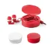 Plastic audio headphones in plastic case. Jack connector 3. 5 mm, cable length 1. 2 m. box ø50 mm
