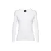 This women's long sleeve T-shirt from THC Bucharest is made of 100% cotton (150 g/m²) with carded cotton yarn, ensuring a comfortable and long-lasting wear. It features a modern cut with a collar and jersey reinforcement ribbon, and is sewn with double seams on the sleeves and bottom for added durability. Available in sizes S-XXL, this fitted jersey T-shirt is a stylish addition to any wardrobe.